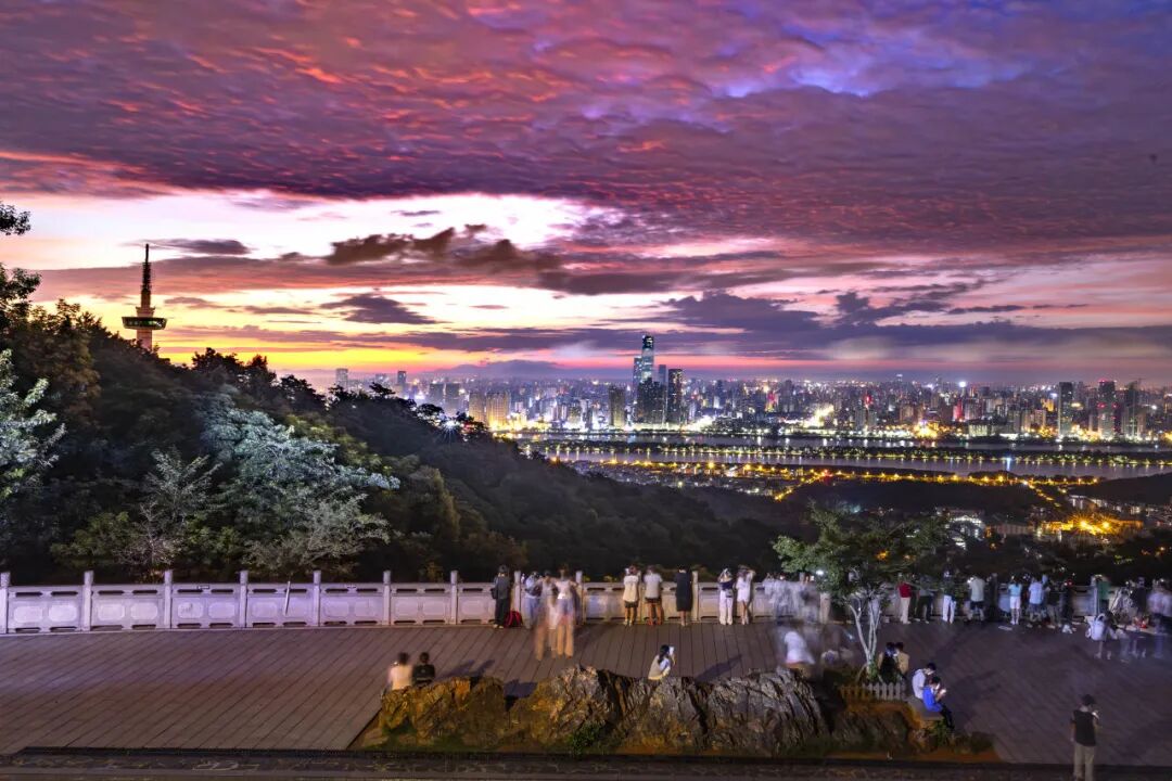 登上山顶观光长廊,整个长沙城尽收眼底。这里是绝佳的观景位置,可以俯瞰湘江、橘子洲头,傍晚时分还能欣赏到绚丽的日落。