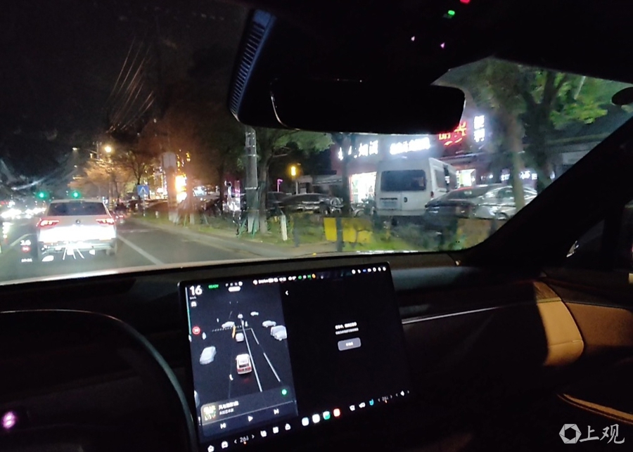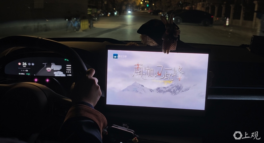在岚图品牌门店,记者与销售人员预约了一款泰山型号大型SUV的试乘试驾。这款车前排包括主驾方向盘后的小屏幕,以及中央的一块大屏幕。试乘一开始,主驾驶的工作人员便设置了导航、开启了辅助驾驶功能,让汽车自己沿着弯曲的停车场出场通道行驶,同时,他在记者要求下,在中控屏上打开了爱奇艺App,视频画面显示在中控屏右侧三分之二的区域,左侧留出了一块导航信息区域。在行驶过程中,视频软件没有限制,可以正常播放电视节目,工作人员偶尔也会瞥一瞥中控屏,操作一下娱乐功能。