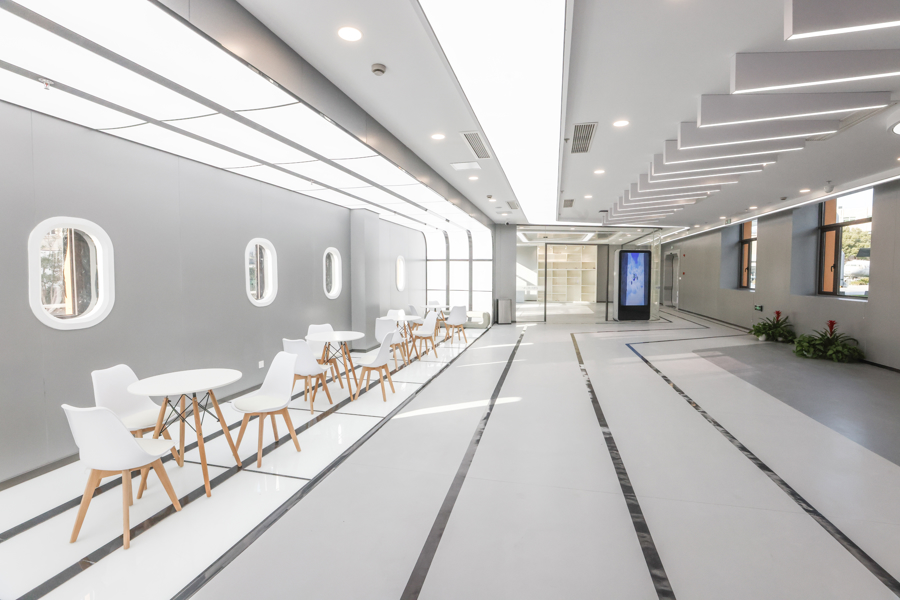 图为游客进入焕新后的接待中心内,犹如来到一个充满未来感的客机舱。