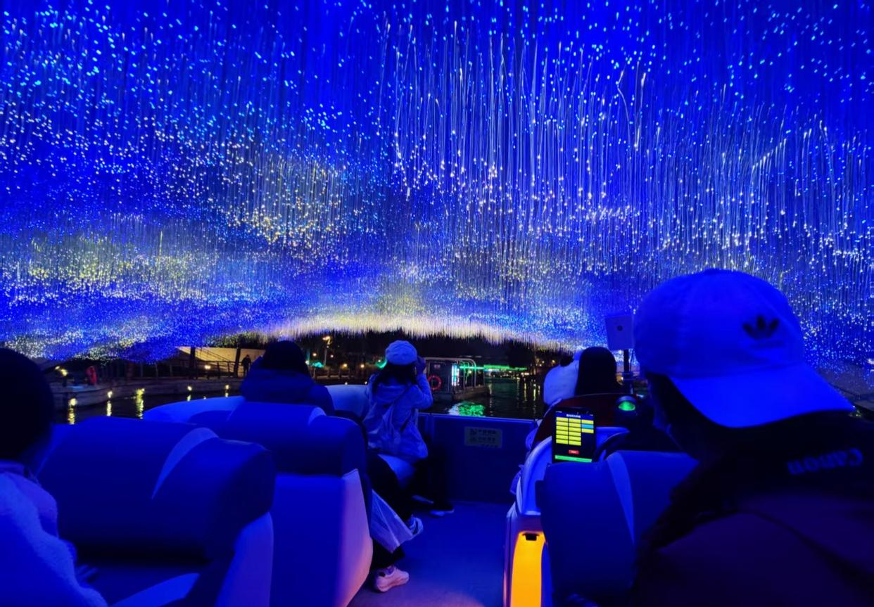 家住朝阳的刘红,周末总是要想方设法找地方遛娃。今年10月初,她通过朝阳文旅的公众号,成功预约到了亮马河国际风情水岸的免费船票,带着女儿一起在船上观看了空中光影表演。当看到鲲鹏光影装置缓缓飞升、表演者凌空起舞时,船上的游客都非常兴奋。刘红说,自己平时很少坐船,如今有个免费的机会在亮马河中漫游,欣赏流光溢彩的水幕光影,感受沿途的星光灯串,实在让人大饱眼福。