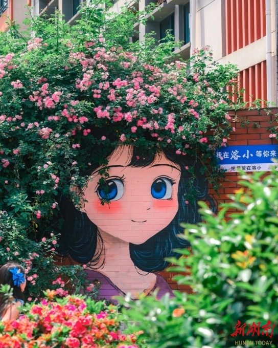 四月,溶江小学校墙上的画中女孩被春天轻轻唤醒。柔粉的蔷薇从墙绘女孩的发梢开始生长,藤蔓是垂落的发丝,花苞是簪在风里的头饰。风一吹,整面墙都簌簌流动,分不清是花在生长,还是她的头发在延长。