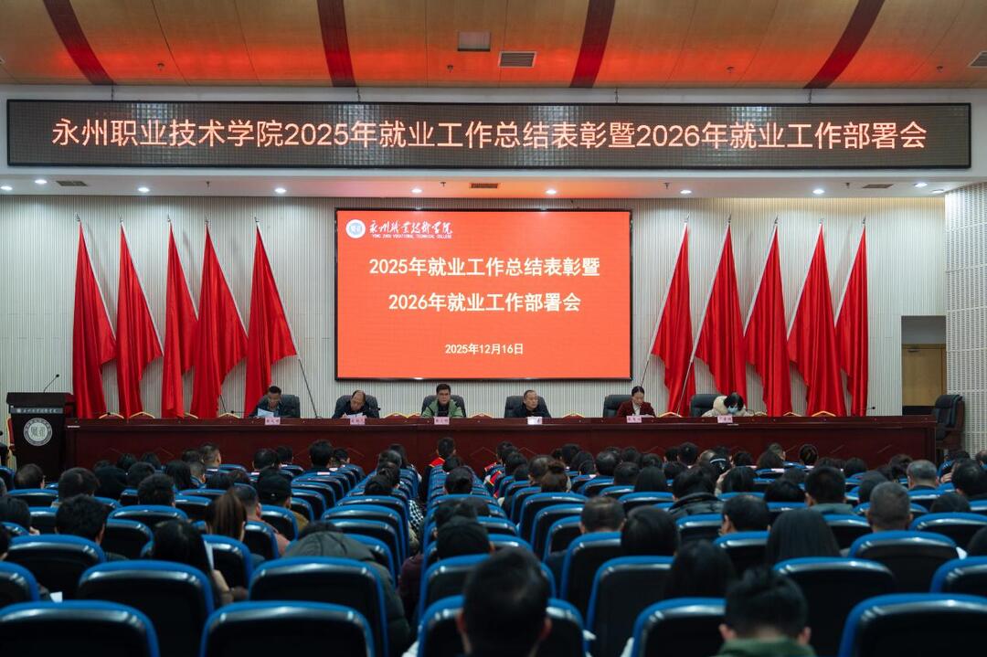 湖南日报·新湖南客户端12月17日讯(通讯员 李元雄 尹安月)12月16日,永州职业技术学院召开2025年就业工作总结表彰暨2026年就业工作安排部署会。学校党委书记黄小明、党委副书记李勇,党委委员、纪委书记宾柱元,党委委员、副校长裴有为,党委委员、宣传统战部部长黄义君,党委委员、组织人事处处长罗素琼,各职能处室、教辅机构正科以上中层干部,二级院部副科以上干部,2025届、2026届毕业班辅导员,招生就业指导处及创新创业中心全体人员参加了会议。会议由党委副书记李勇主持。