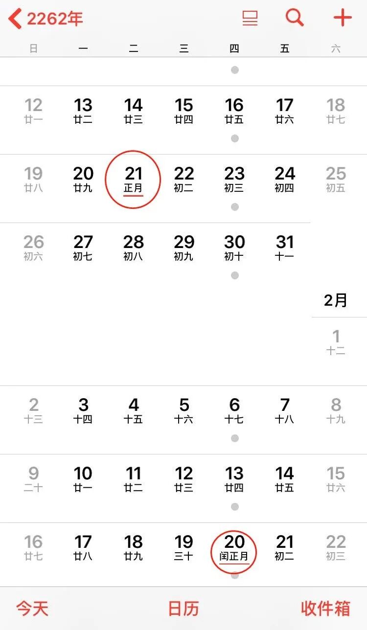 查询万年历显示,2262年1月21日是农历正月初一(第一个春节),2月20日是闰正月初一(第二个春节),也就是说,2262年确实存在两个正月。这种闰正月现象十分罕见。