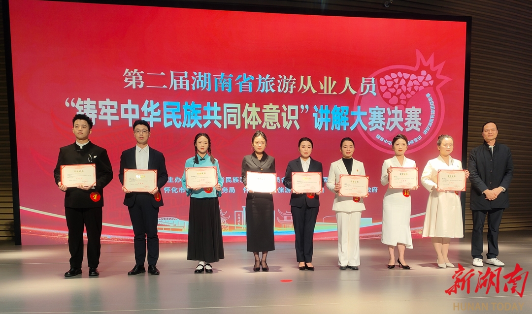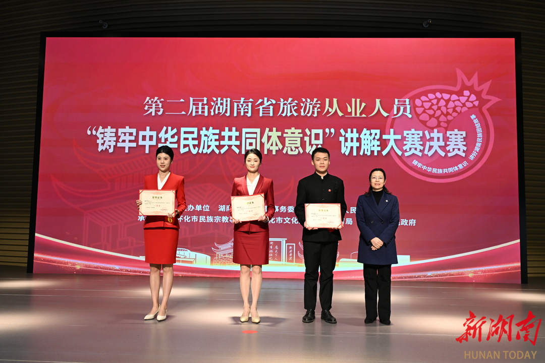 比赛现场,16位选手各展风采,或深情讲述本地民族交往故事,或深入阐释旅游助力民族团结进步的实践路径,生动诠释了 “一个导游就是一个民族团结宣讲员” 的深刻内涵。最终,湘潭袁道鑫《时空书信传真情,石榴花开籽籽红》、长沙张奕铭《杏花里的湘疆情》与彭书仪《墨香沁润民族情》斩获一等奖,张家界的杜双、长沙的黄芳、郴州的谢尚蓓、衡阳的宋先晶及谭倩芸荣获二等奖,来自怀化、邵阳等市州的8名选手获得三等奖。