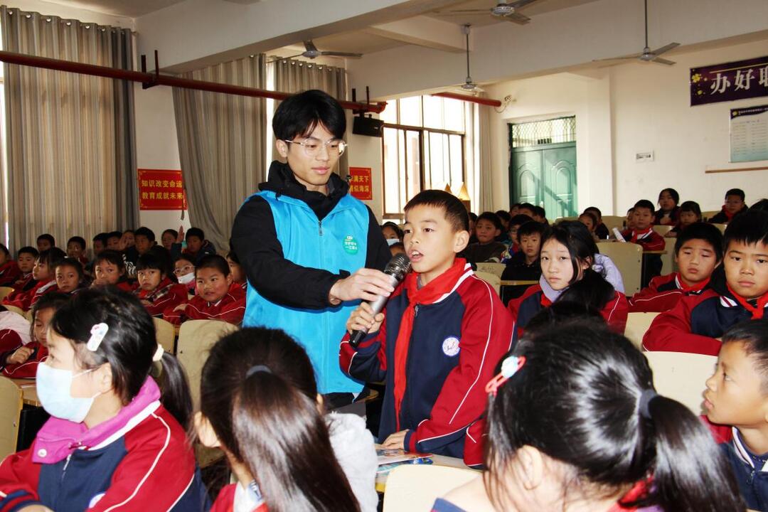 为将宏大的国家战略与鲜活的乡土实践相结合,活动特别邀请了大洲乡安全村党支部书记钟存兴加入宣讲队伍。钟书记以村内蓬勃发展的油茶产业和正在探索的林业碳汇项目为生动教材,向孩子们讲述了安全村如何将生态保护与经济发展有机结合,真正让“绿叶子”变成了“金果子”。接地气的讲述和身边的实例,让“绿水青山就是金山银山”的理念不再抽象,激发了孩子们对家乡生态的自豪与守护之情。在最后的互动环节,宣讲团设置了趣味十足的“生态知识大闯关”互动答题,围绕水资源保护、垃圾分类、污染防治等与生活息息相关的内容进行提问。同学们踊跃举手、争相作答,在轻松热烈的氛围中巩固了环保知识,深化了“保护环境、人人有责,从小事做起、从我做起”的行动共识。