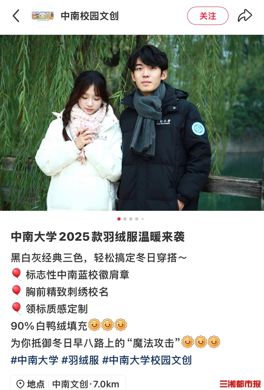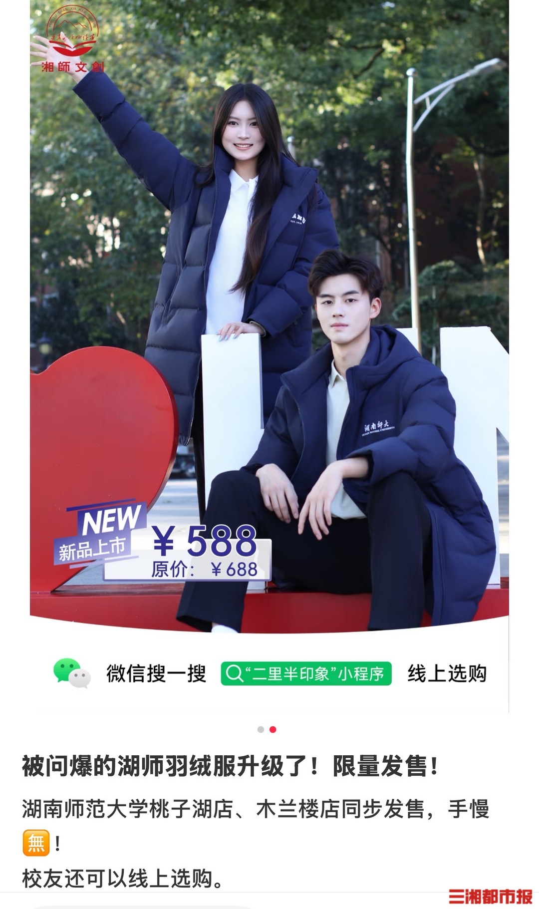 寒潮来袭,羽绒服消费进入旺季。今年的冬日消费市场上,高校文创羽绒服凭借高充绒量、经典设计与独特情怀,成为年轻人追捧的“潮品”。不仅全国多所名校款式卖断货,湖南高校也纷纷入局。近日,记者走访发现,中南大学、湖南师范大学推出的定制款羽绒服,同样收获师生与校友的密切关注。
