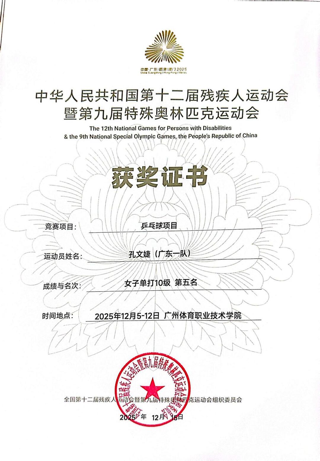 长沙民政职院老服2131班毕业生孔健焜是从校田径队走出的,在全国残运会赛场上,他展现了非凡实力。孔健焜先后勇夺男子T12级800米金牌及男子T11-T13级4x100米接力金牌。田径训练不仅赋予他竞技技能,更塑造了他“不畏艰难、永不言弃”的坚韧品格、自立自强的超越精神以及在接力赛中至关重要的“信任协作”团队精神。这份荣耀根植于校园沃土,赛场上的璀璨金牌,正是昔日校园体育育人最生动的回响。