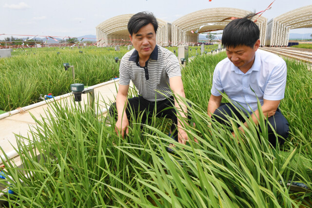 “这是全球领先的室外多盐度水稻耐盐性精准鉴定平台,大棚上安装了雨感器,晴天大棚会自动折叠,下雨了大棚会自动打开,每一个小方格的盐度都可以精准调控。”艾治勇说,不同于普通水稻科研,耐盐碱水稻科研要求田块里的盐度可控,才能确保实验数据精准、科研成果有效。