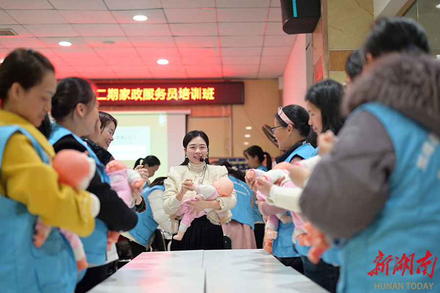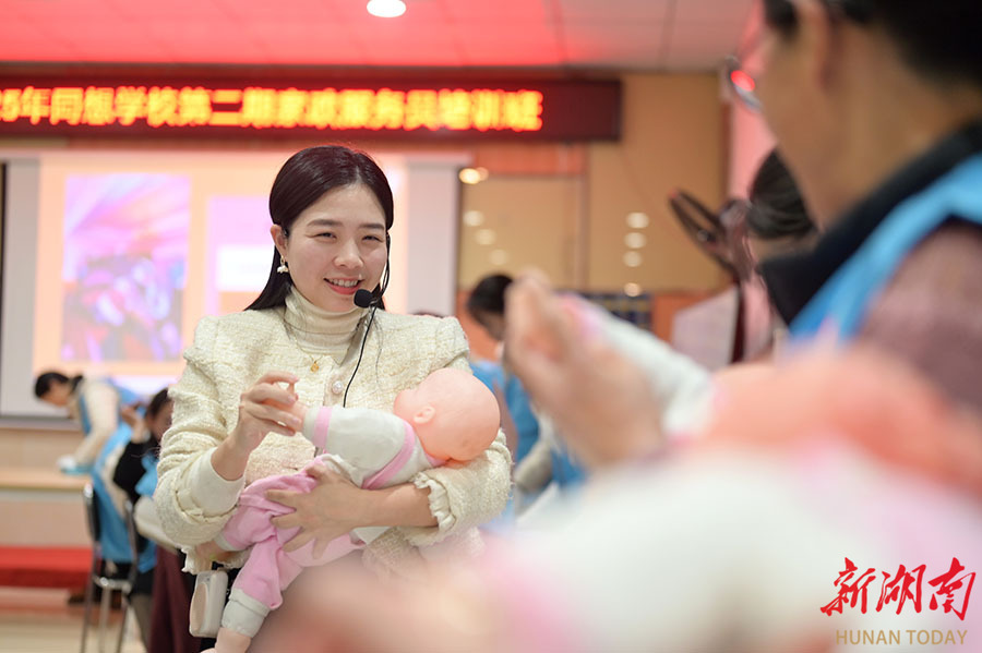 12月18日,双峰县同想职业技能培训学校,老师在教导学员进行育婴技能实操训练。近年来,该县通过免费职业技能教育,帮助群众掌握实用技术,有效拓宽就业渠道,增强民生发展动能。 李建新 余莎莎 摄影报道(湖南图片库)