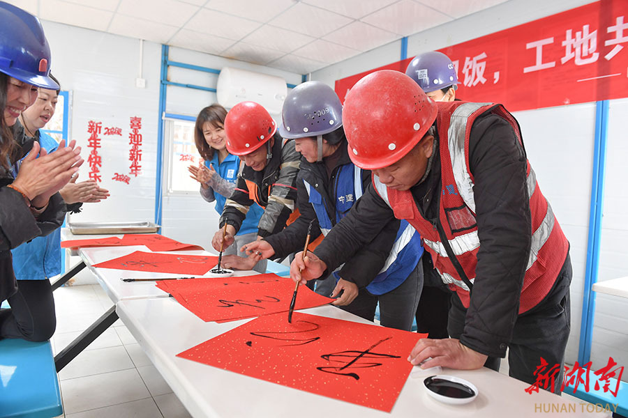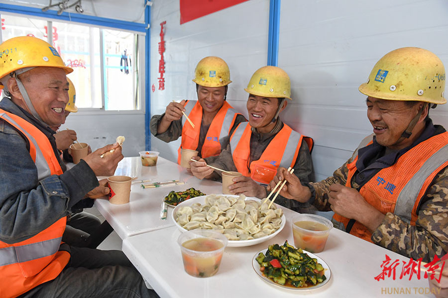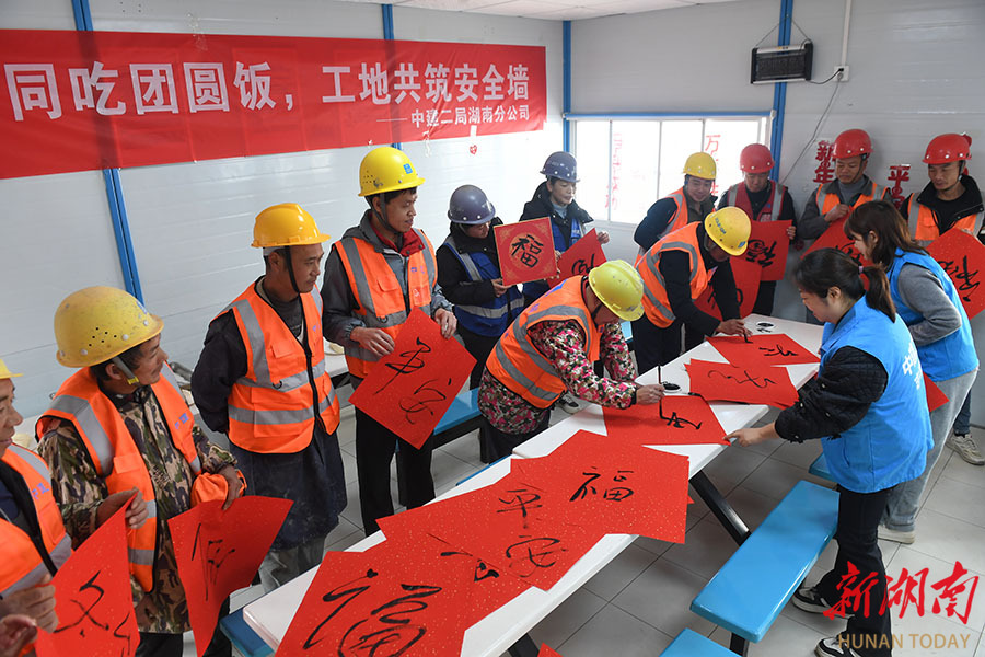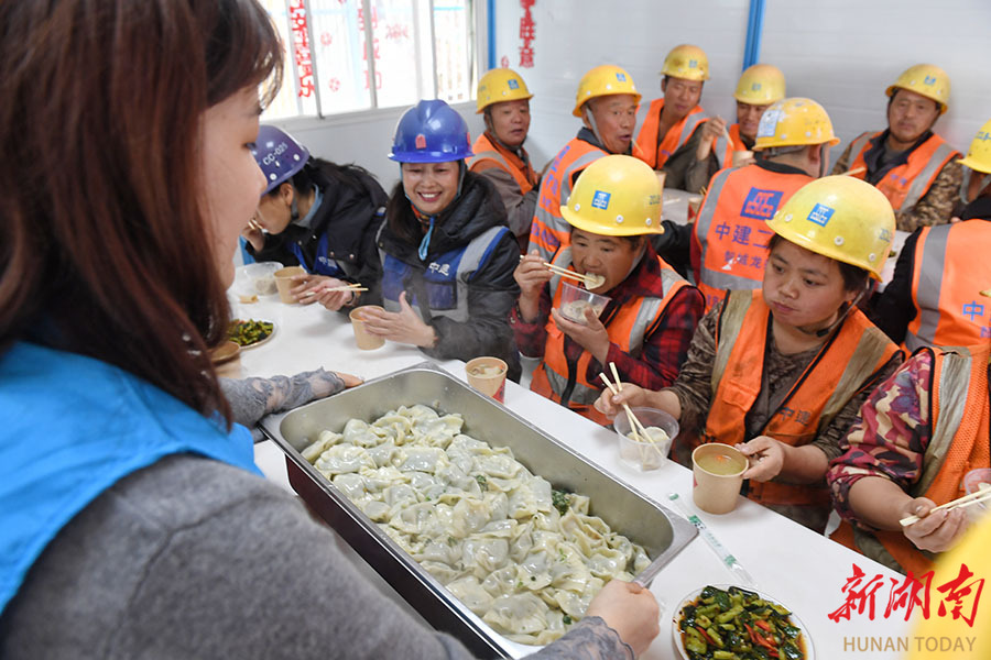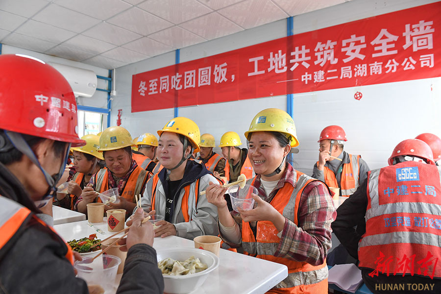 12月18日,中建二局湖南分公司在长沙所辖项目工地开展“冬至同吃团圆饭 工地共筑安全墙”主题活动,邀请一线工友吃饺子、写福字。活动现场,志愿者为一线建筑工人送上热腾腾的饺子,让工友们在冬至前夕感受家的温暖。 湖南日报全媒体记者 徐行 通讯员 邹园 摄影报道