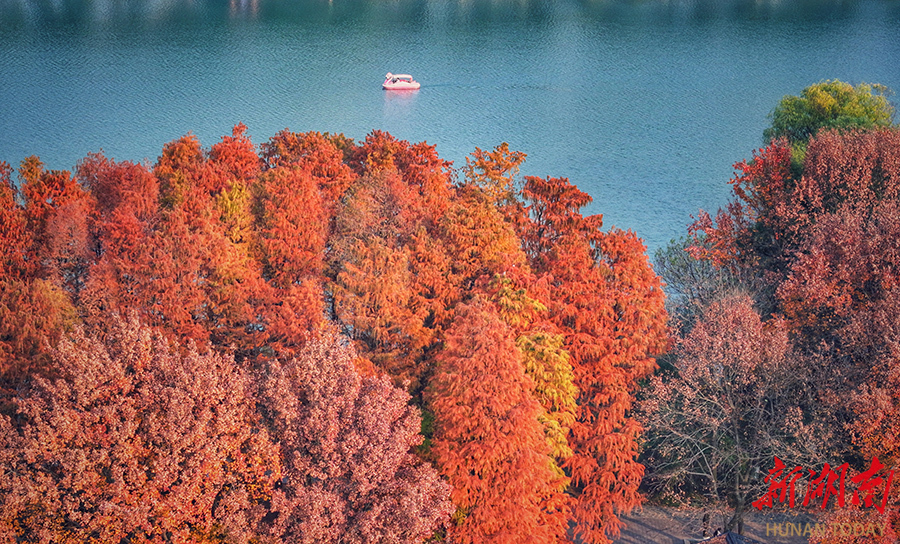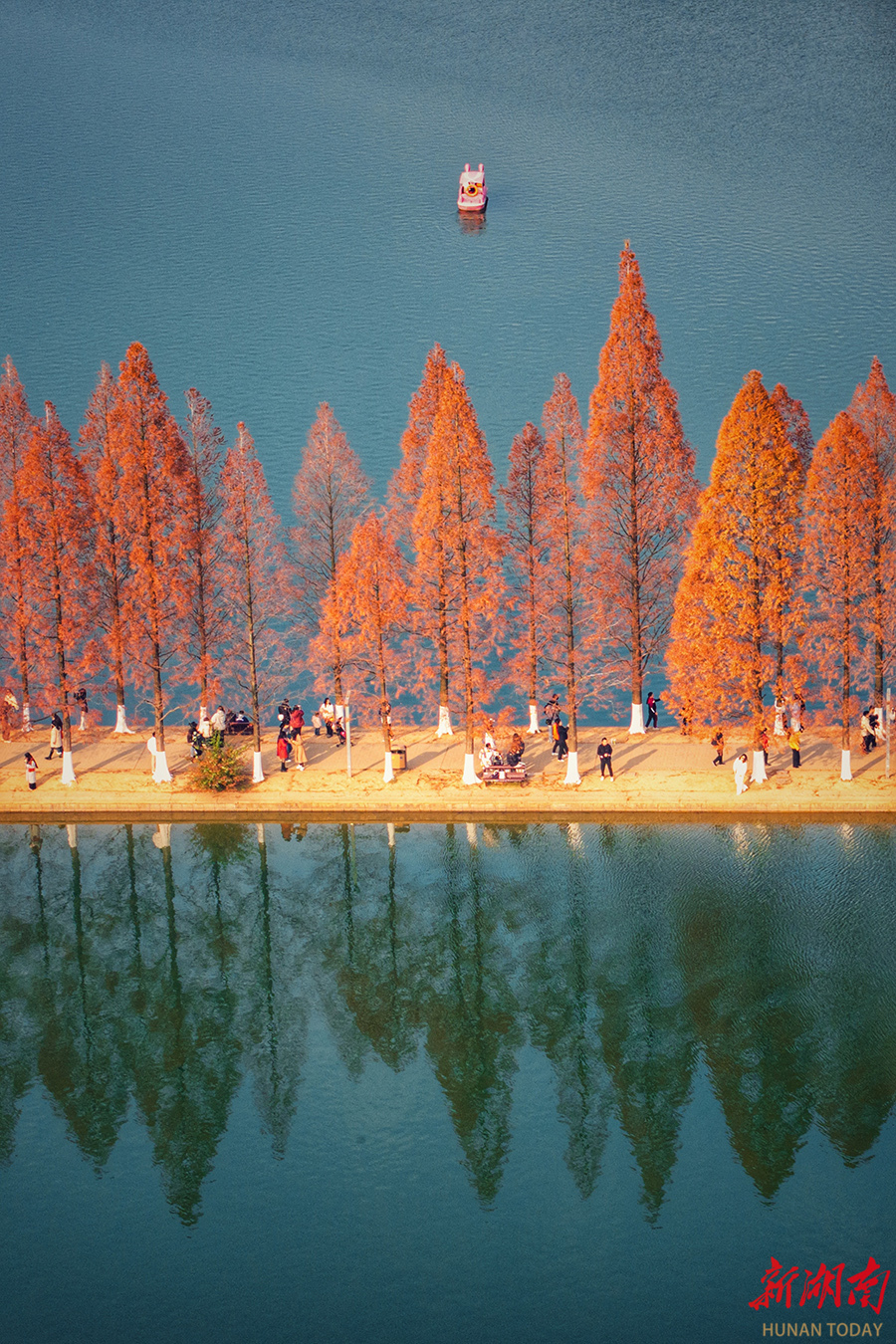 12月18日,湖南烈士公园年嘉湖畔,连绵的水杉林披上了赤红金黄的艳丽“冬装”,成为一道亮丽的风景线。 湖南日报全媒体记者 童迪 摄