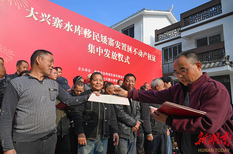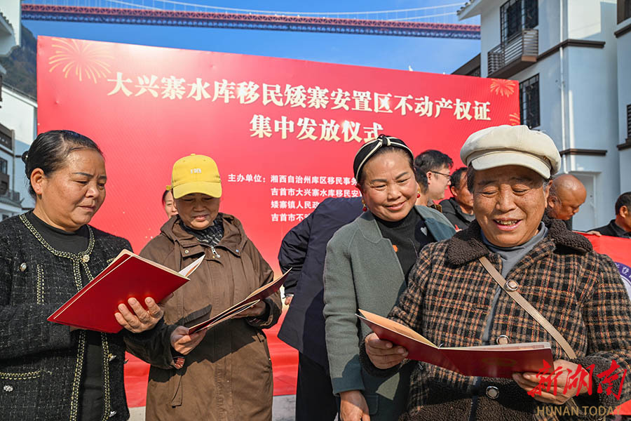 12月18日,移民安置户开心地领取到属于自己的“红本本”。当天,吉首市举行大兴寨水库矮寨移民安置区不动产权证书集中发放仪式,55户安置户开心地领到象征产权保障的“红本本”,实现了从“住有所居”到“住有所权”的关键一步。 湖南日报全媒体记者 郭立亮 摄