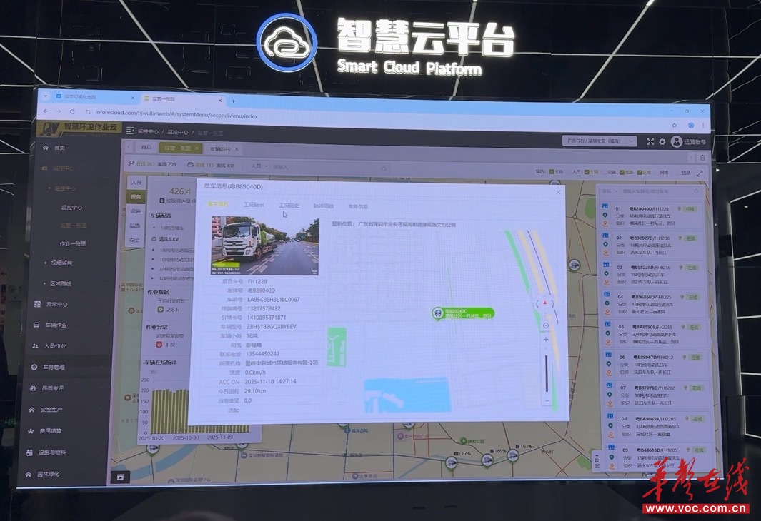 打开智慧环卫云平台,大屏幕上显示实时可调取的各项数据指标。“大家看到的这台深圳的环卫作业车,红色轨迹就是它的作业路线。”工作人员指着大屏介绍,平台通过实时回传数据,精准判断车辆是否规范作业;每辆车配备6至8路高清摄像头,能自动识别急刹、超速等危险驾驶行为并上传。据介绍,该平台研发投入超2.5亿元,目前日活用户超8万,接入物联网设备19万台,设备在线率95%。
