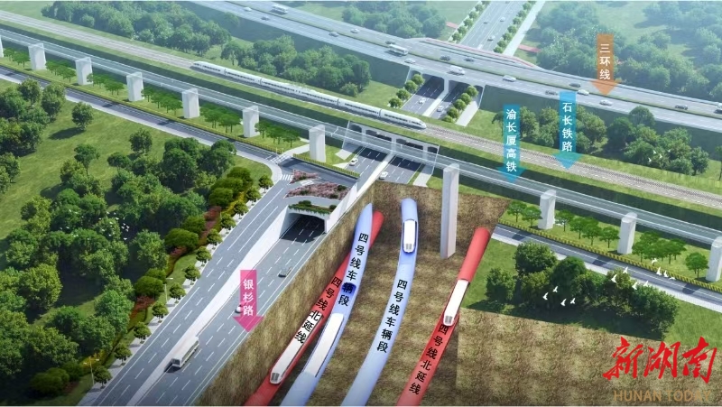 “这正是该项目最难之处。”项目负责人邱伟介绍,银杉路项目在短短的720多米长度内涉及“三铁两高”,即渝长厦高铁、石长铁路、地铁4号线、绕城高速以及110kV高压电力铁塔,施工时需要由南往北依次穿过星月路、石长铁路和绕城高速,同时上跨地铁4号线,可谓在交通主动脉中“穿针引线”,容不得半点偏差。