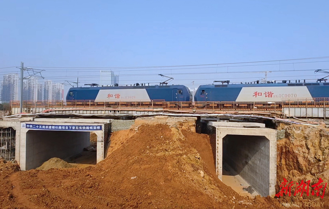 项目现场,记者看到石长铁路横贯银杉路,一列火车正呼啸而过,铁路下方,钢筋混凝土箱涵顶进作业火热进行,与此同时,长沙地铁4号线还在地底运行。