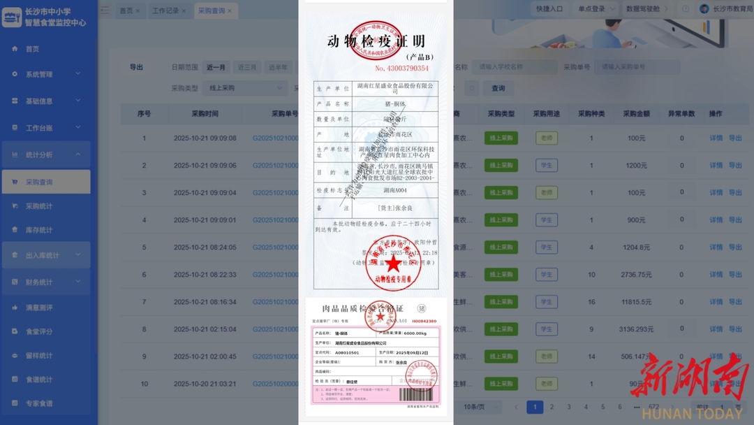 如今,长沙市学校食堂全面实行大宗食材集中采购,经严格审核纳入750家配送企业。采购流程全面智能化:学校线上下单,食材经智能秤称重后数据实时回传,从源头杜绝“虚增”;每笔订单的合格证、验收单同步上传系统,形成全程可溯的闭环。