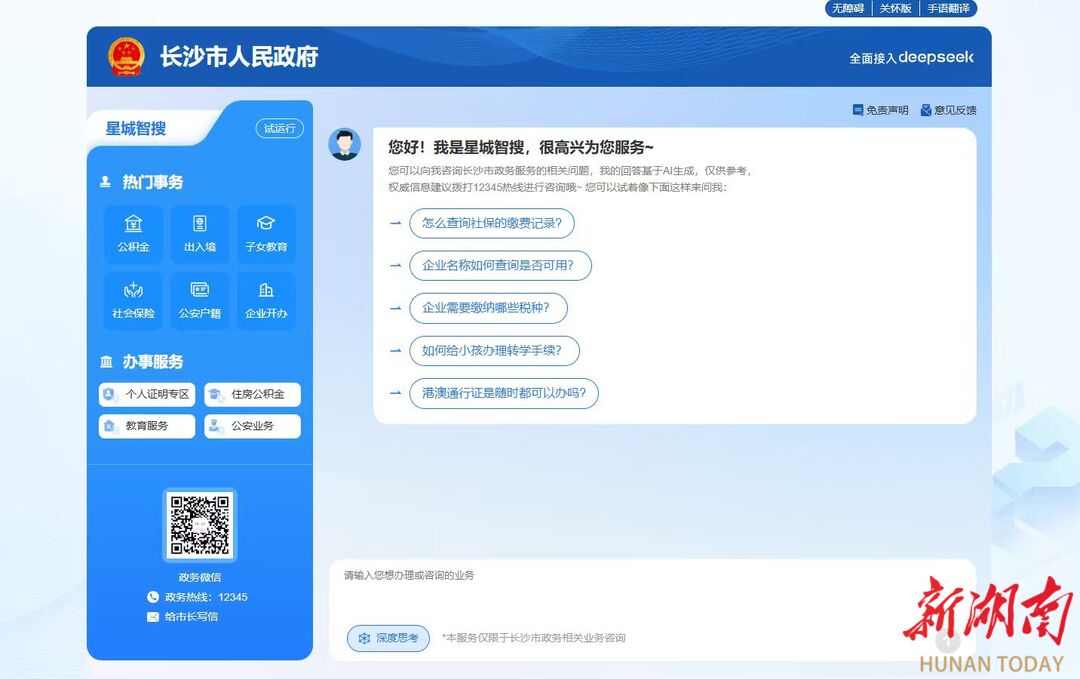 在“人工智能+”行动深入实施的背景下,长沙以AI技术为核心驱动力,积极探索数字政府建设新模式,推动政务服务从“被动响应”向“主动伴随”转型,从“能用”向“好用、爱用”跨越。今年,长沙市数据局联合湖南大学国家超级计算长沙中心,率先在市政府门户网站接入国产自主研发的DeepSeek大模型,打造“星城智搜”智能服务应用体系,全面覆盖“读、找、问、办”四大政务场景,实现从“单点功能”到“全场景智能”的升级。