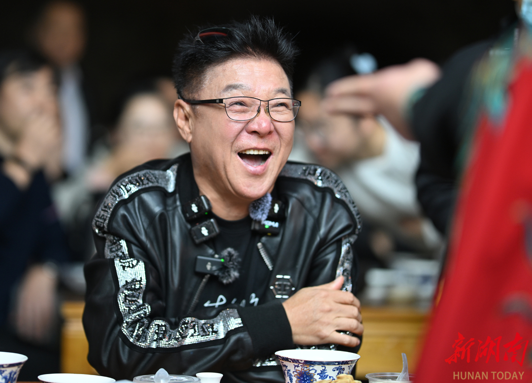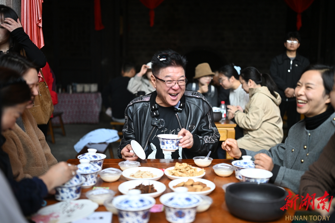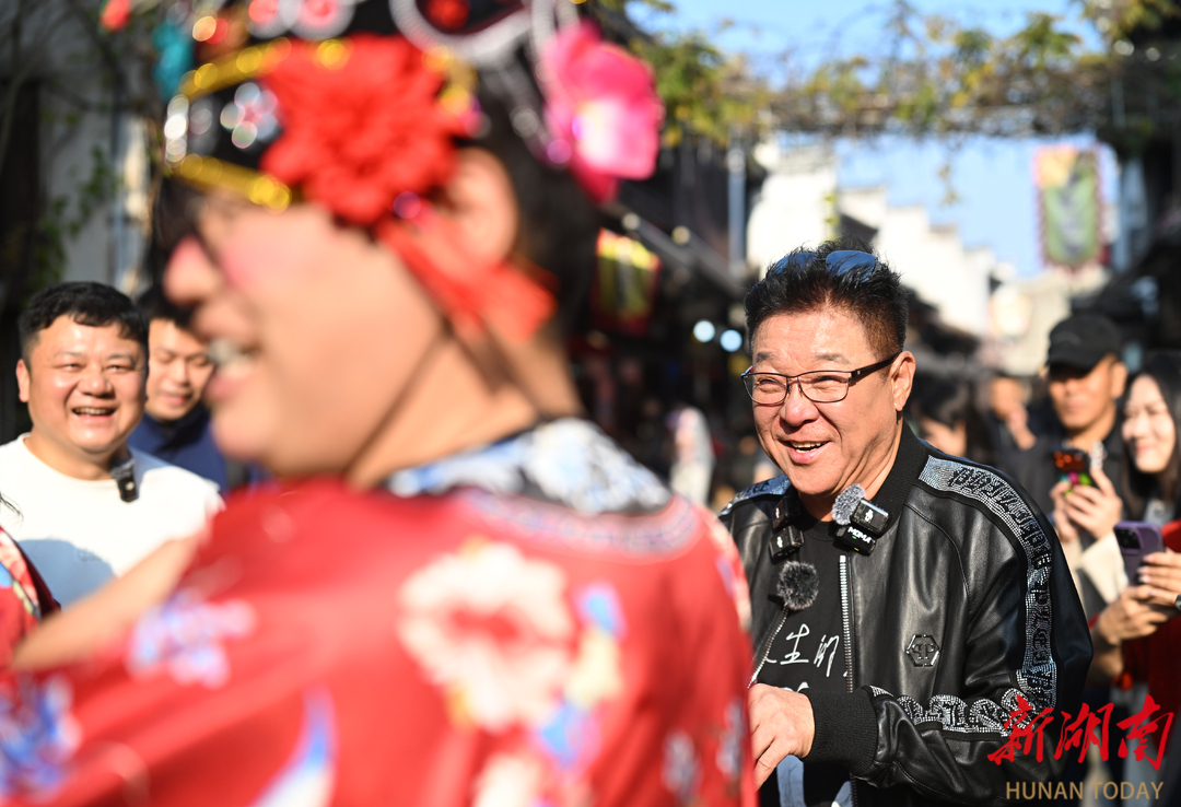 八元堂前,热辣的“媒婆天团”簇拥而上,用爽朗的长沙俚语与这位远道而来的“情歌诗人”打趣;暖心的芝麻豆子茶、清甜的非遗甜酒、古戏台上花鼓戏《刘海砍樵》精彩唱段,都让他连称“好韵味”。