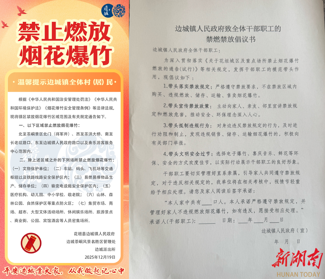 依据《花垣县城区全面禁止燃放烟花爆竹专项整治行动实施方案》,边城镇人民政府联合边城派出所、边城茶峒风景名胜区管理处,确定边城茶峒景区烟花爆竹禁放范围,细化辖区管控实施方案,精准划定东至边城镇人民政府路口、南至长老坟路口、西至茶洪大桥、北至茶峒景区北门(将军井)及曲乐游客服务中心的核心禁放区域。同时,在重点路段、人员密集区张贴宣传标语,依托村村响广播、微信群等载体,全方位开展禁放宣传。