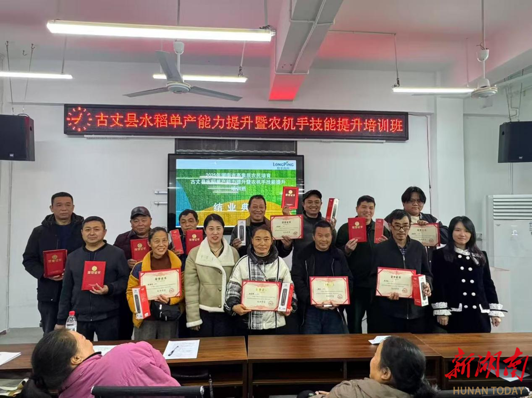 新湖南客户端12月19日讯(通讯员 张棋铭 张好)“拿到结业证书,心里更有底了!回去就把学到的技术用在稻田里,争取今年水稻再增产!”近日,湘西土家族苗族自治州古丈县高素质农民水稻单产能力提升暨农机手技能提升班结业仪式举行,来自断龙山镇的种植大户杨胜国手捧结业证书,脸上满是喜悦。