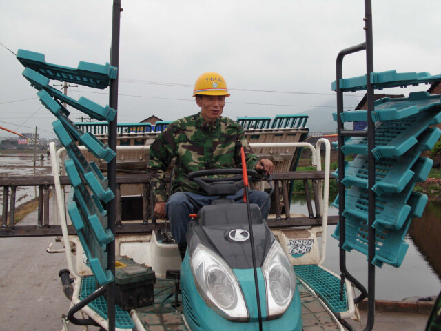 (彭雄武驾驶农机进行插秧作业。通讯员 供图)