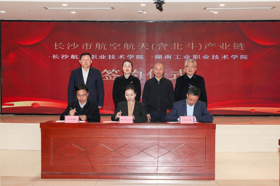 湖南日报12月19日讯(通讯员 赵常霖 李伟 谢红桂 刘嫄)12月18日,长沙市航空航天(含北斗)产业链办公室、湖南工业职业技术学院、长沙航空职业技术学院举行三方合作签约仪式。根据协议,未来三方将围绕长沙市航空航天(含北斗)产业发展需求,在多个维度开展深度合作。产业链办公室将统筹企业需求,两校将整合机械制造、航空维修等优势专业资源,对接飞机起降系统、大飞机复材制造、新兴商业卫星研制等,共建航空航天(北斗)实训基地,开展订单式人才培养,联合攻克产业链关键技术难题,实现行业需求与职教供给的深度绑定。