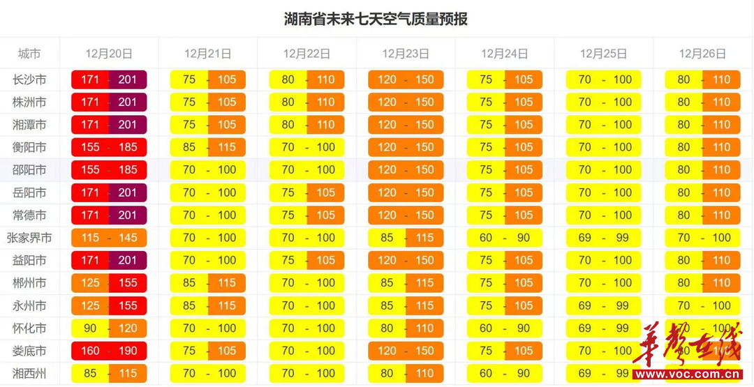 空气质量方面,预计12月20日湘西州为良,张家界、怀化、永州、郴州为轻度污染,其他9个城市为中度污染,局地有重度污染风险。