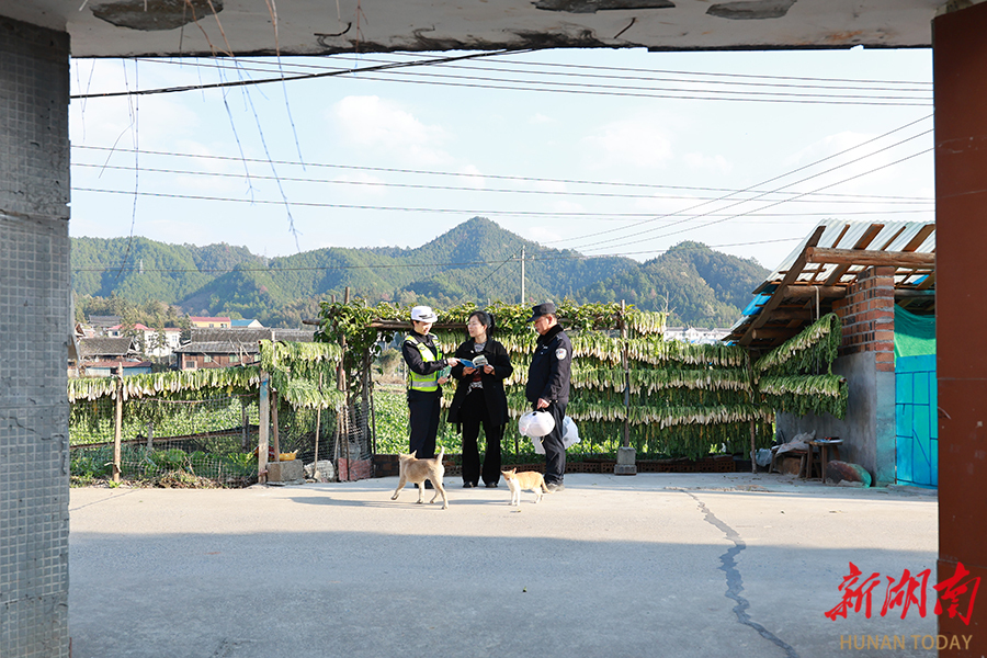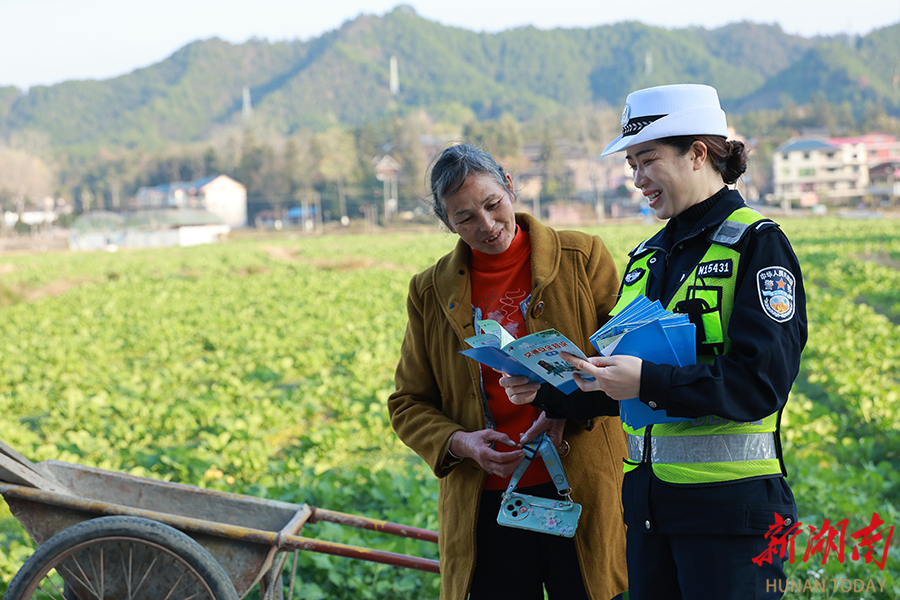 12月19日,通道侗族自治县万佛山镇杏花村,民警在向群众宣传安全知识。连日来,该县交警联合各派出所不定期组织民辅警进村入户向“一老一小”群体宣讲防诈和交通安全知识,提升群众自我保护意识,筑牢安全防线。 石猛雷 摄(湖南图片库)