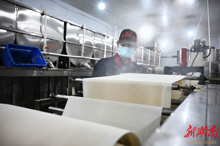 12月19日,澧县澧南镇天子山社区,企业员工在千张生产线上忙碌。入冬以来,澧县道水瑶豆制品有限公司加紧生产传统豆制品,备战元旦春节消费旺季,满足节日市场需求。 柏依朴 彭思媛 摄影报道(湖南图片库)