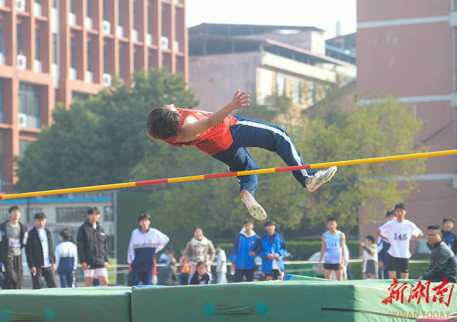12月18日,道县第二中学,参赛运动员在参加跳高比赛。当天,道县第43届中小学生运动会举行,运动员们在赛场上奋勇争先,一展风采,尽享运动带来的快乐。 蒋克青 蒋正争 摄影报道(湖南图片库)