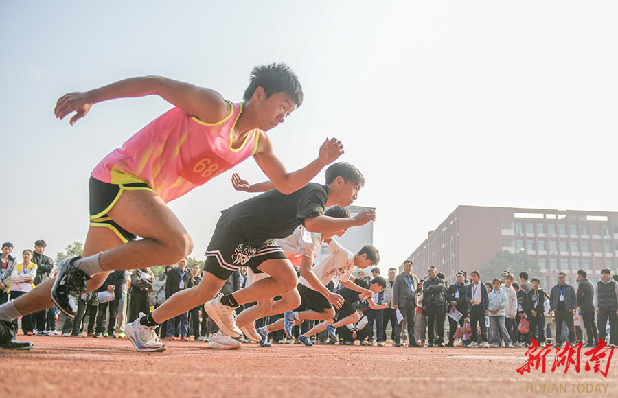 12月18日,道县第二中学,参赛运动员在参加跑步比赛。当天,道县第43届中小学生运动会举行,运动员们在赛场上奋勇争先,一展风采,尽享运动带来的快乐。 蒋克青 蒋正争 摄影报道(湖南图片库)