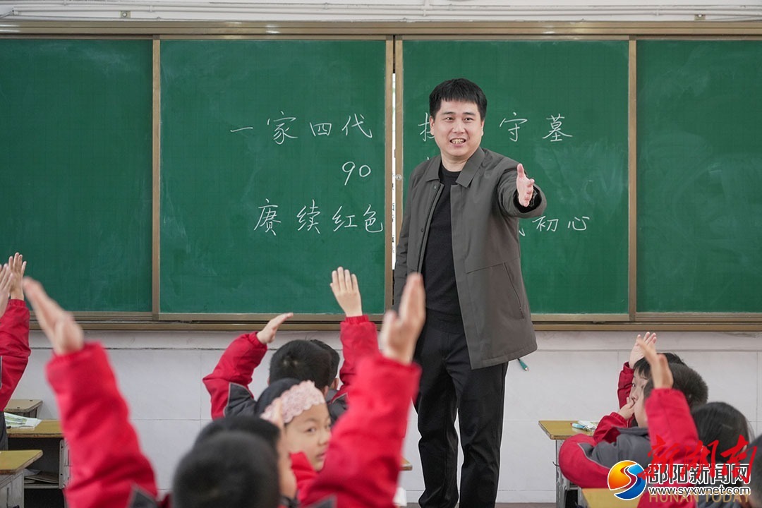 12月18日,洞口思源实验学校的课堂格外安静,孩子们的目光聚焦于讲台。文锴并未直接给出答案,而是娓娓道来一个身边的真实故事——洞口县“一家四代,接力守护红军墓九十载”的感人事迹。通过他深情讲述,那段关于承诺、坚守与信仰的红色记忆,仿佛穿越时空,深深触动了每一位在场学生。