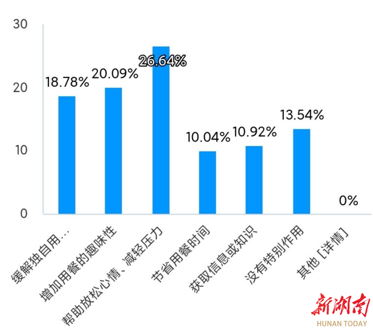 “电子榨菜”能在大学生圈里火起来,可不光是为了打发吃饭的时间。调查显示,26.4%的人表示它能“帮助放松心情、缓解压力”,还有近两成的学生是为了“缓解独自吃饭的孤独感”。在快节奏、高压力的校园生活中,“电子榨菜”就像个随手能拿到的“情绪充电宝”,让学生在吃饭的短短十几分钟里,能给紧绷的心情放个假、充个电。