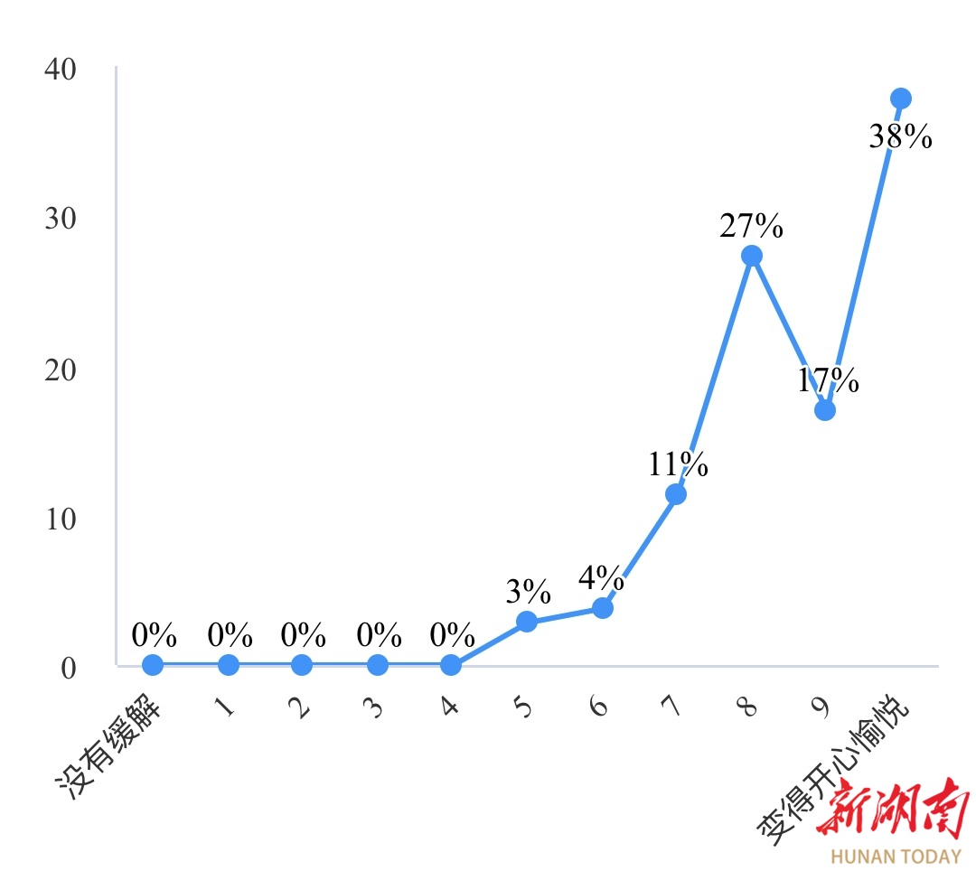 根据问卷数据图显示,桃黑黑的内容对缓解青年内心紧绷感效果显著:所有受访者均表示有不同程度的缓解,77.08%的受访者给出8分及以上的高分评价,37.74%的人更是直言达到了“变得开心愉悦”的程度。