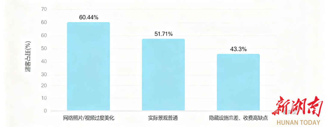 游客在抵达网红景点前,往往已通过短视频、社交平台等方式积累了极高的期待。然而调研数据显示,超过六成的游客认为实际体验与网络宣传存在明显差距。其中,60.44%的人指出“网络照片/视频过度美化,实际景观普通”;51.71% 的人感受到“人群拥挤,体验与预期不符”;另有43.3%的人认为“宣传突出亮点,隐藏了设施差、收费高等缺点”。