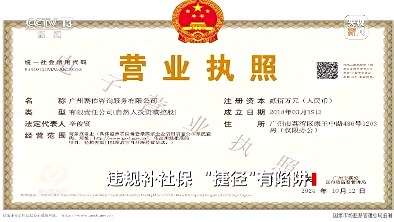 广州市公安局天河区分局刑警大队办案人员:这家公司前期确实是有帮人家办补缴社保的,但是补缴社保是有前提的,本身来找他办社保的这些人是符合条件补缴社保的,只是来办的人不了解这些政策,去找了他们,他们公司配合这个人去做了补缴社保,确实有办成功的。也存在这些公司去做假的,做假证明帮人家办了补缴社保,前期有存在。