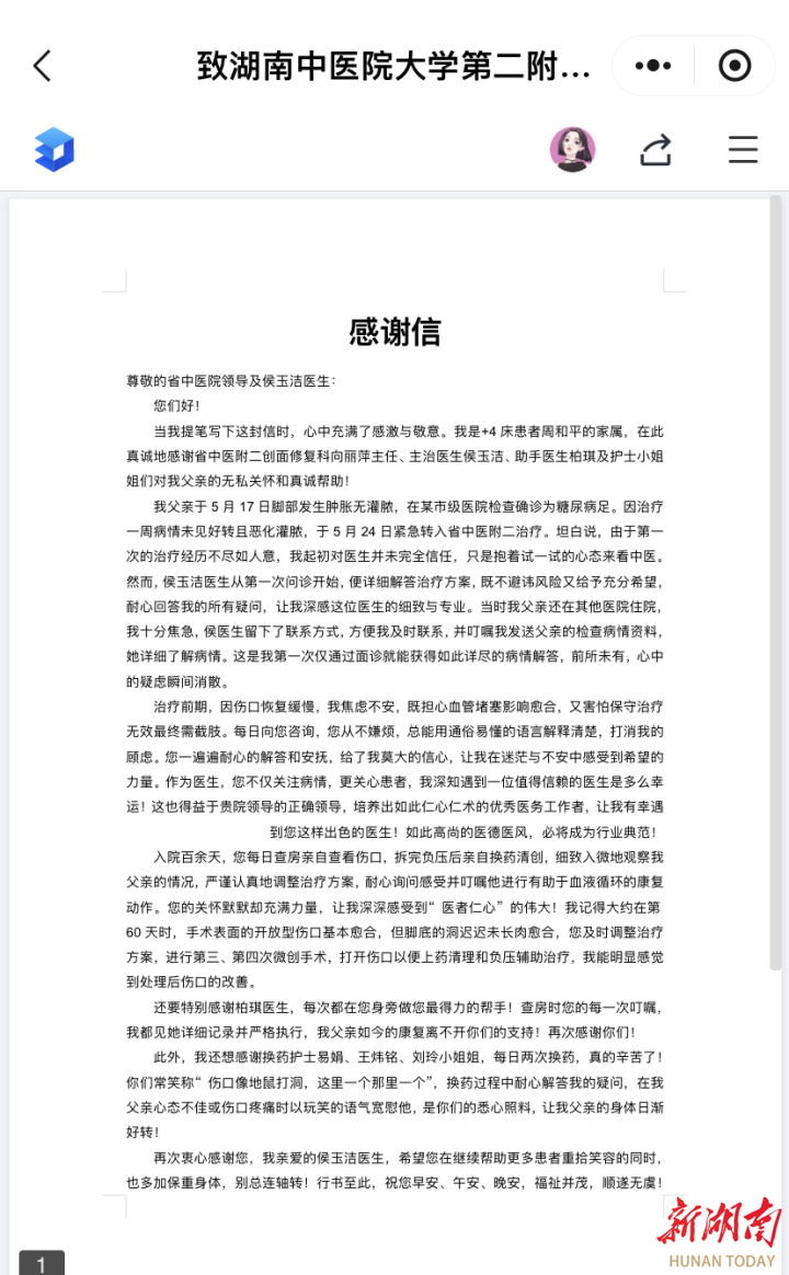 大众卫生报·新湖南客户端12月20日讯(通讯员 陈安妮 记者 王璐)近日,湖南中医药大学第二附属医院皮肤中心创面修复科收到一份特殊的赞誉——一封来自“省长信箱”的感谢信。信中,长沙市民周先生的女儿字字恳切,向主治医师侯玉洁及医护团队表达由衷谢意:“您的耐心解答和安抚,让我们在迷茫不安中看到希望!”这场历时三个月的糖尿病足保足之战,也因这份温暖的回响而更显动人。