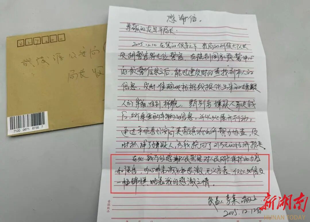 湖南日报·新湖南客户端12月20日讯 近日,张家界市公安局武陵源分局收到一封群众亲笔手写信,信中真挚感谢民警快速破获电信网络诈骗案,为其全额挽回21万元经济损失。同日,写信人李先生将一面印有“人民警察为人民 失而复得暖人心”的锦旗送至分局刑侦大队。