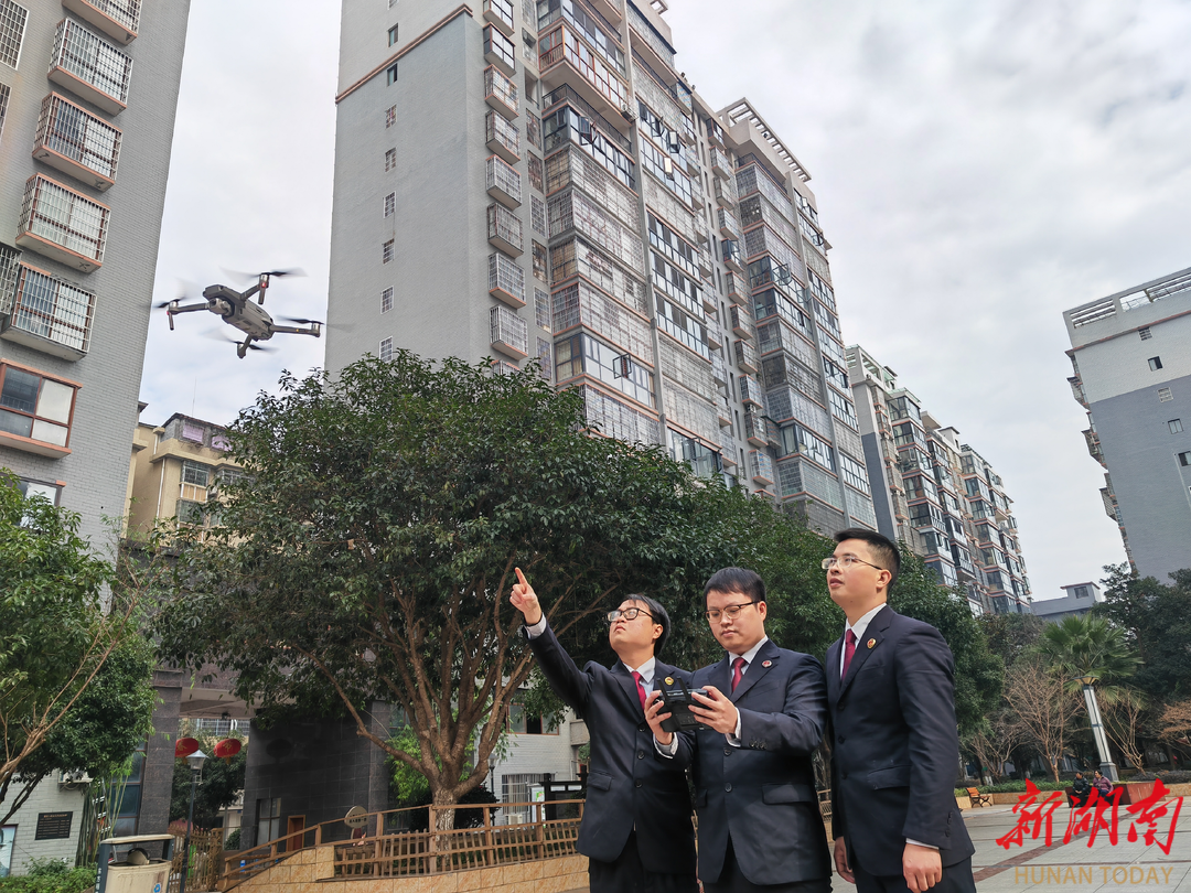 绥宁县人民检察院干警在操控无人机对小区外墙修复情况进行巡检。
