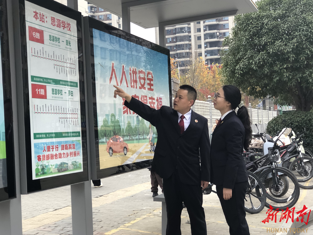 隆回县人民检察院干警在实地走访查看学校周边公交站台建设情况。
