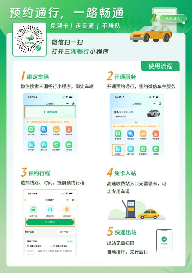 “预约通行”和“无感支付”功能使用前,用户需在“三湘畅行”小程序完成车辆绑定,并签约开通微信自动扣款服务,即可按需选择。