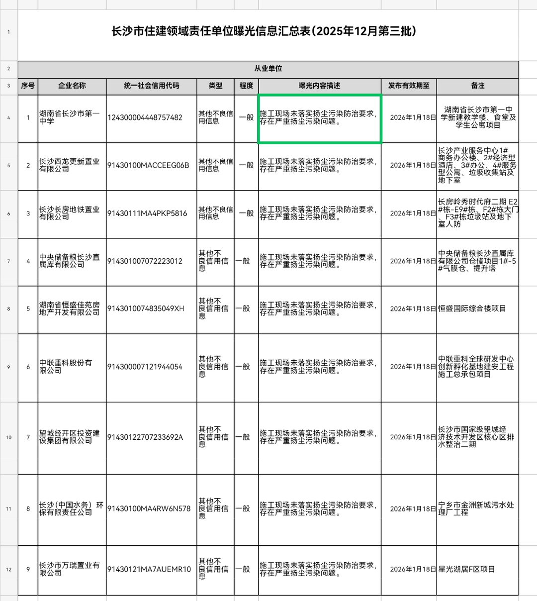 湖南日报·新湖南客户端12月20日讯(记者 王文)今日,长沙市住建局发布2025年12月第三批住建领域责任单位曝光信息,9个项目因施工现场未落实扬尘污染防治要求被集中通报,其中包括湖南省长沙市第一中学新建教学楼、食堂及学生公寓项目等重点工程。