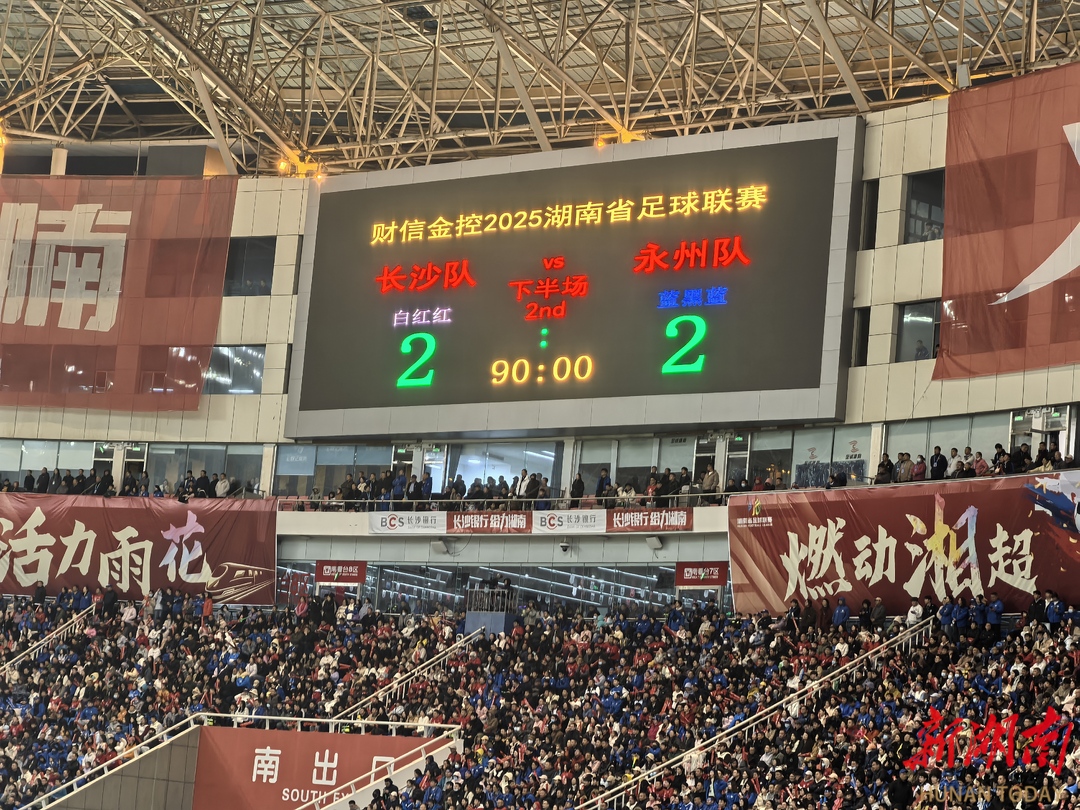 12月20日晚,“湘超”联赛首场半决赛进行,长沙队在主场贺龙体育场迎战永州队。长沙队与永州队鏖战90分钟,2:2战平,正式进入点球大战!(湖南日报·新湖南客户端记者 肖霄)