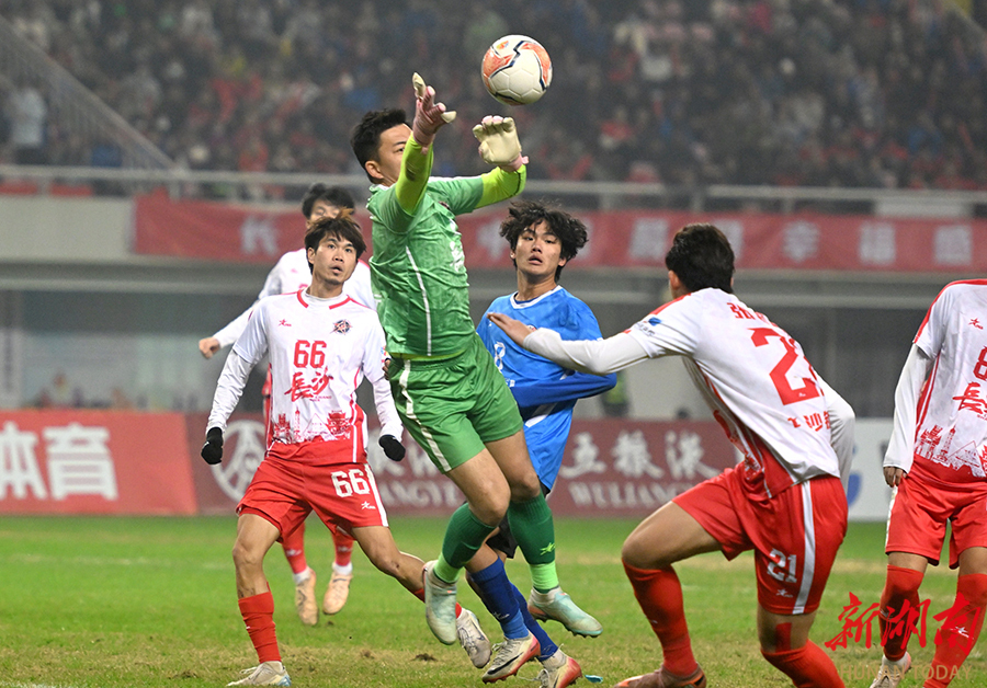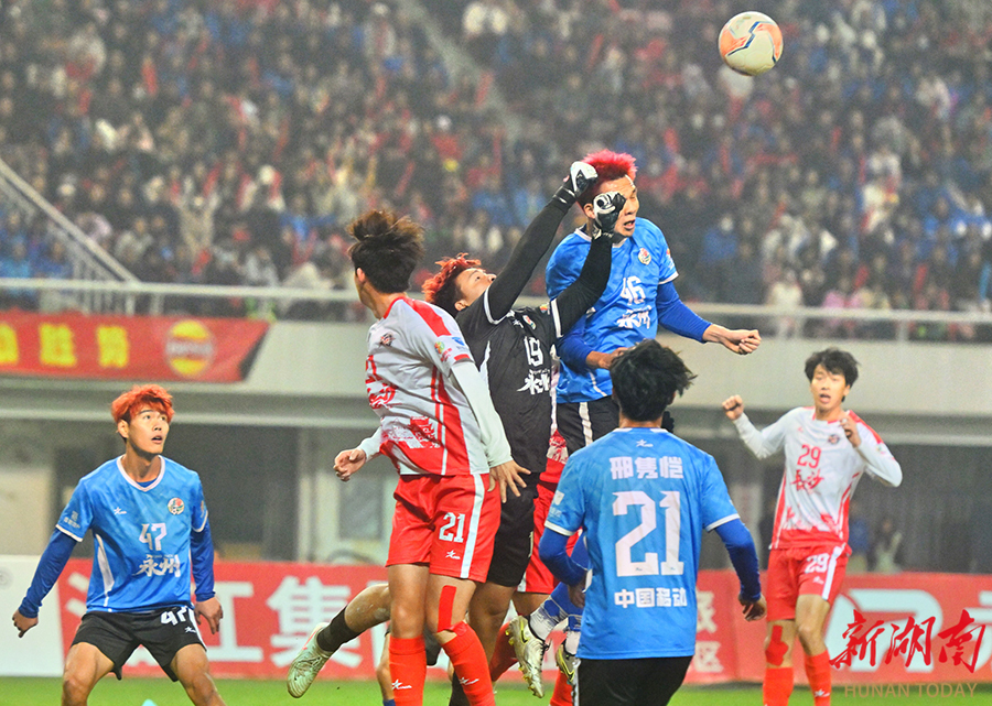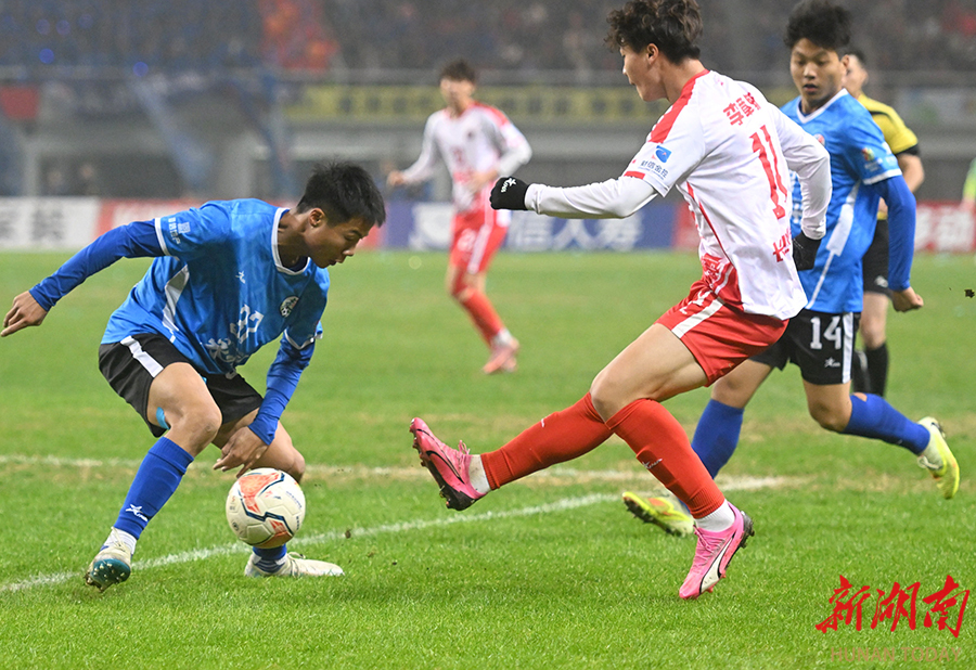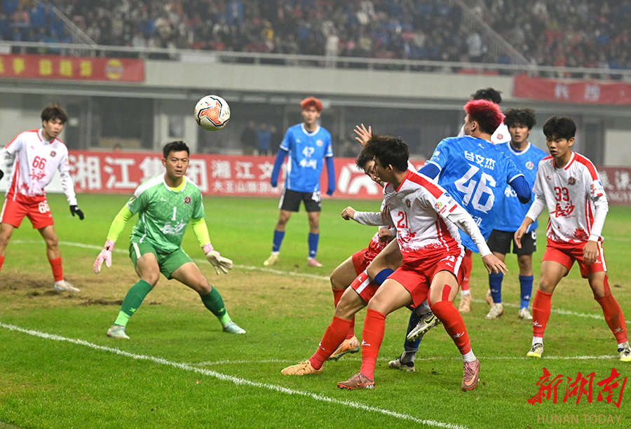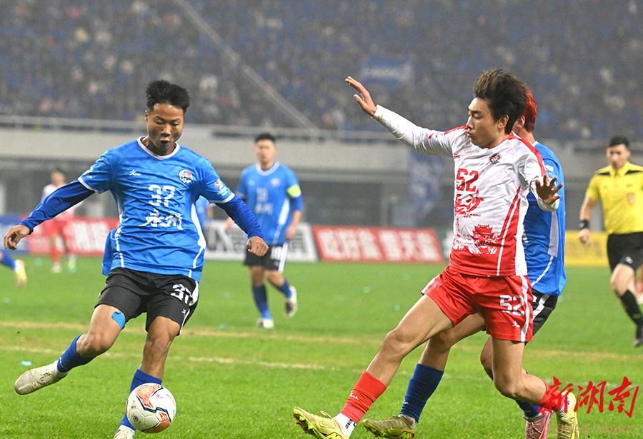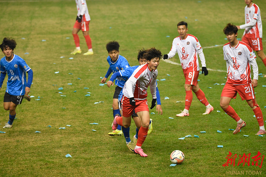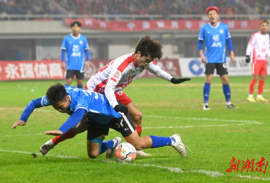 12月20日晚,长沙贺龙体育场,双方球员在比赛中激烈拼抢。当天,湘超联赛半决赛开赛,“实力之王”长沙队(红)主场迎战“流量之王”永州队,比赛2:2进入点球大战。最终,永州队客场9:8战胜长沙队。 湖南日报全媒体记者 郭立亮 摄