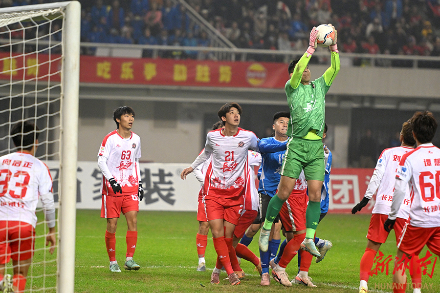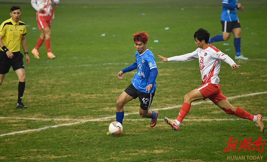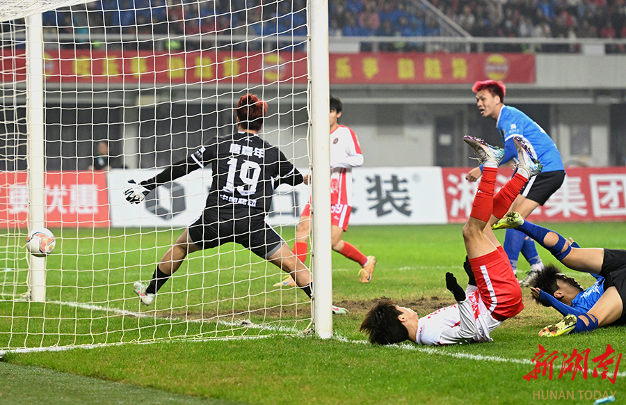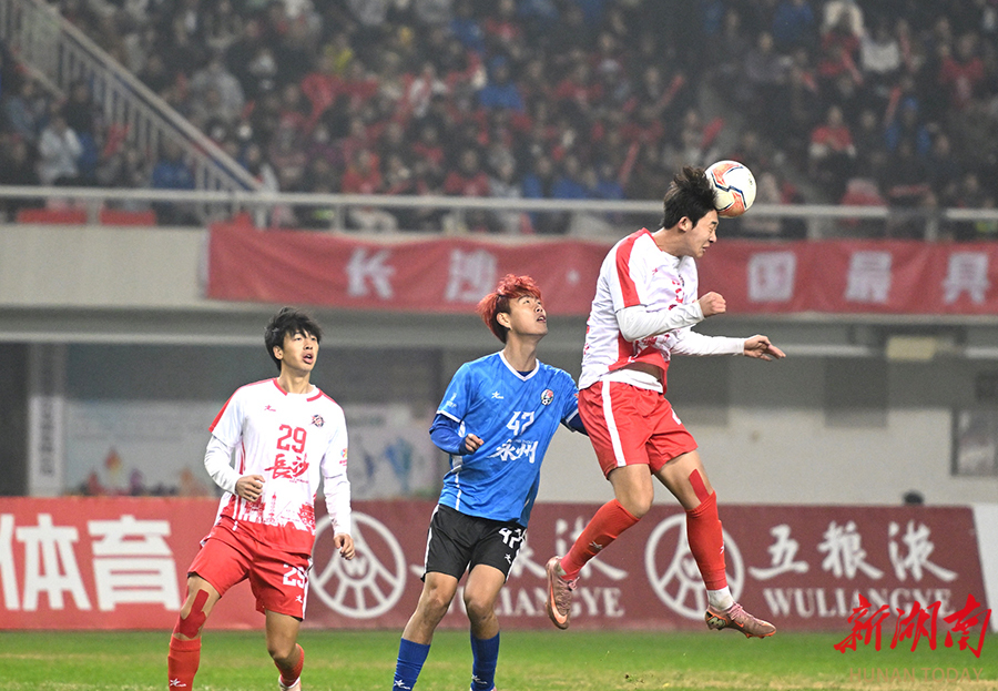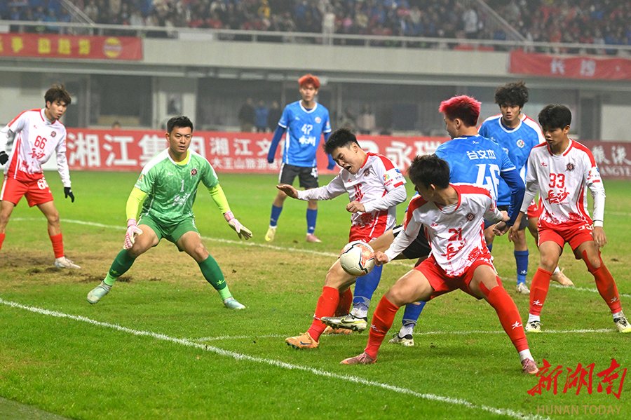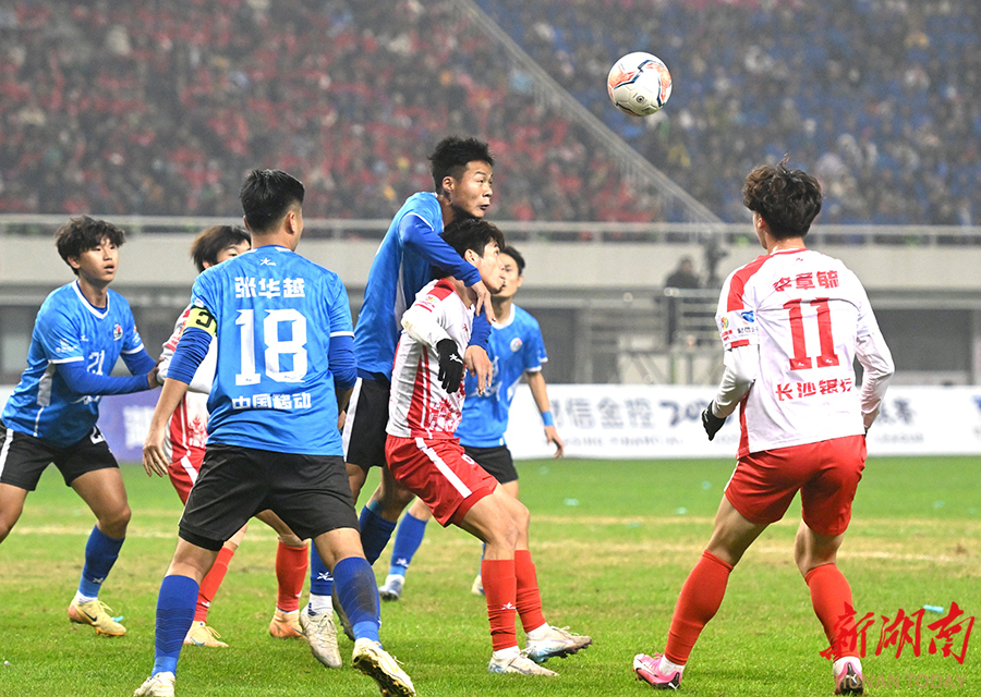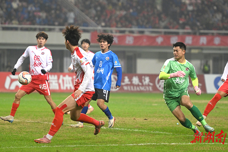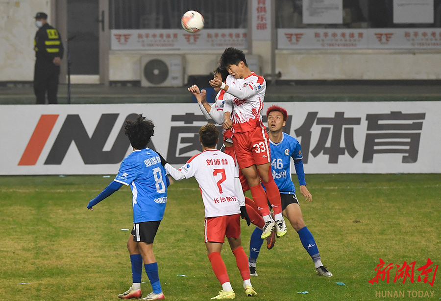 12月20日晚,长沙贺龙体育场,双方球员在比赛中激烈拼抢。当天,湘超联赛半决赛开赛,“实力之王”长沙队(红)主场迎战“流量之王”永州队,比赛2:2进入点球大战。最终,永州队客场9:8战胜长沙队。 湖南日报全媒体记者 郭立亮 摄