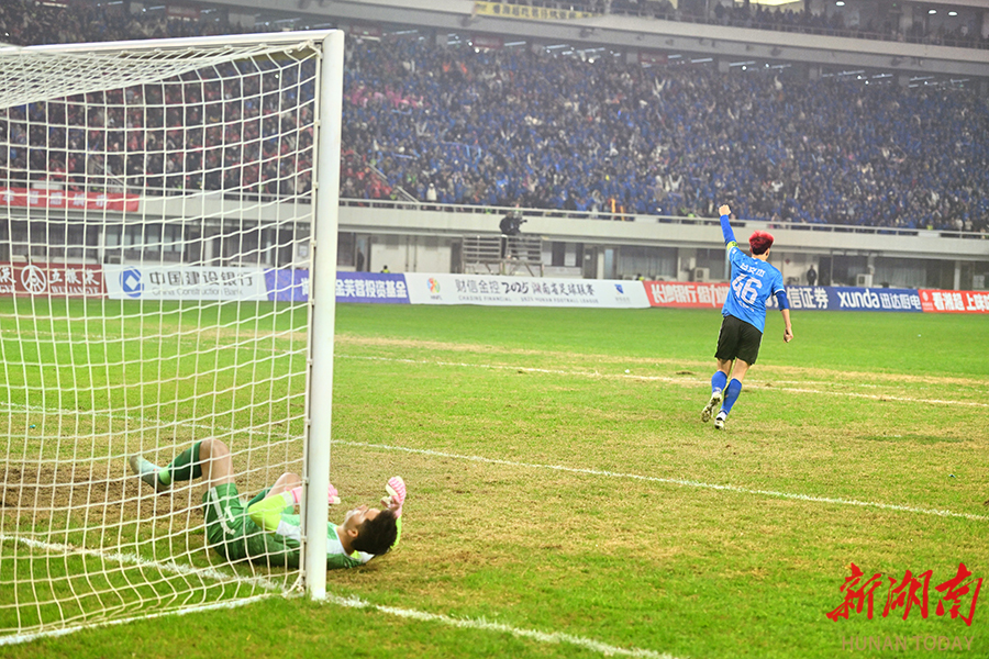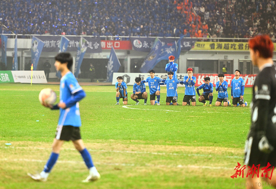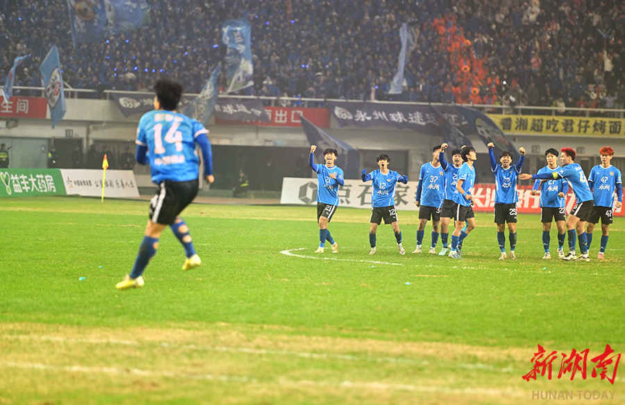 12月20日晚,长沙贺龙体育场,永州队队员在欢呼庆祝。当天,湘超联赛半决赛开赛,“实力之王”长沙队(红)主场迎战“流量之王”永州队,比赛2:2进入点球大战。最终,永州队客场9:8战胜长沙队。 湖南日报全媒体记者 郭立亮 摄