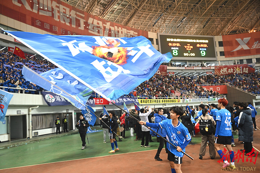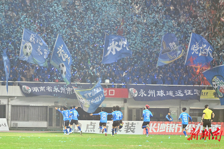 12月20日晚,长沙贺龙体育场,永州队队员和球迷在欢呼庆祝。当天,湘超联赛半决赛开赛,“实力之王”长沙队(红)主场迎战“流量之王”永州队,比赛2:2进入点球大战。最终,永州队客场9:8战胜长沙队。 湖南日报全媒体记者 郭立亮 摄