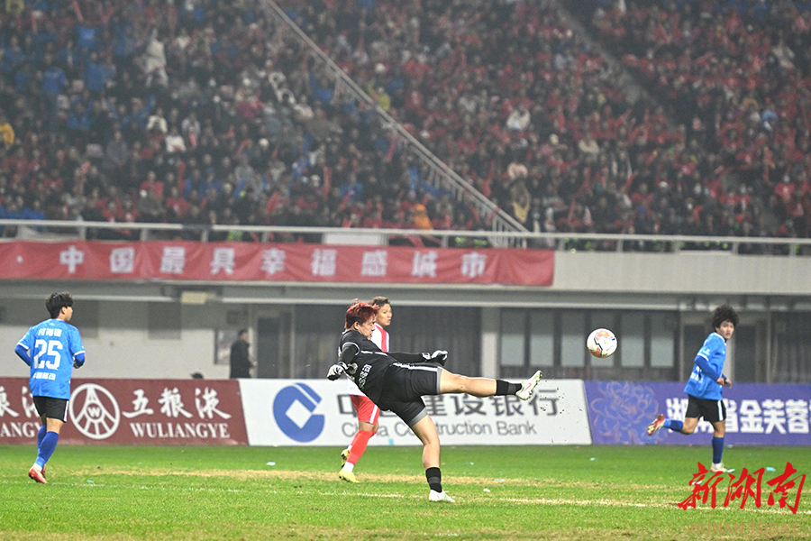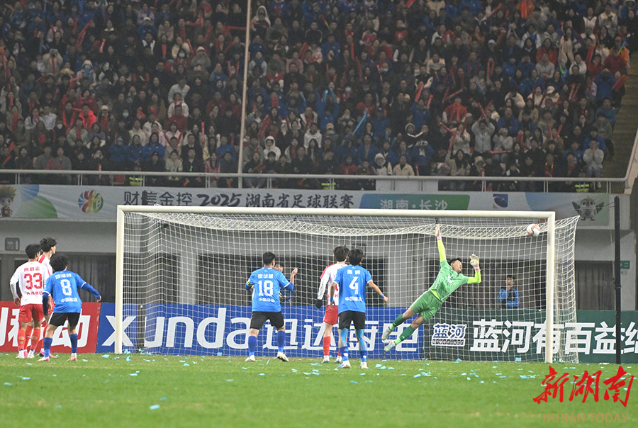 12月20日晚,长沙贺龙体育场,长沙队队员在踢点球。当天,湘超联赛半决赛开赛,“实力之王”长沙队(红)主场迎战“流量之王”永州队,比赛2:2进入点球大战。最终,永州队客场9:8战胜长沙队。 湖南日报全媒体记者 郭立亮 摄
