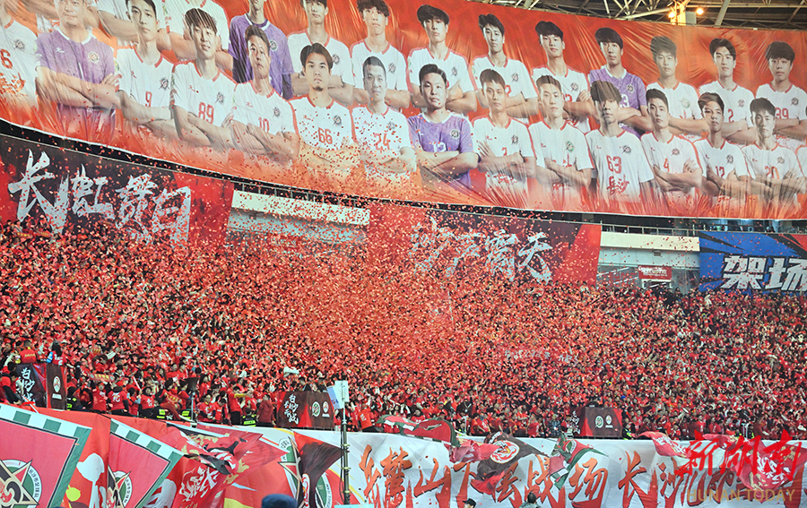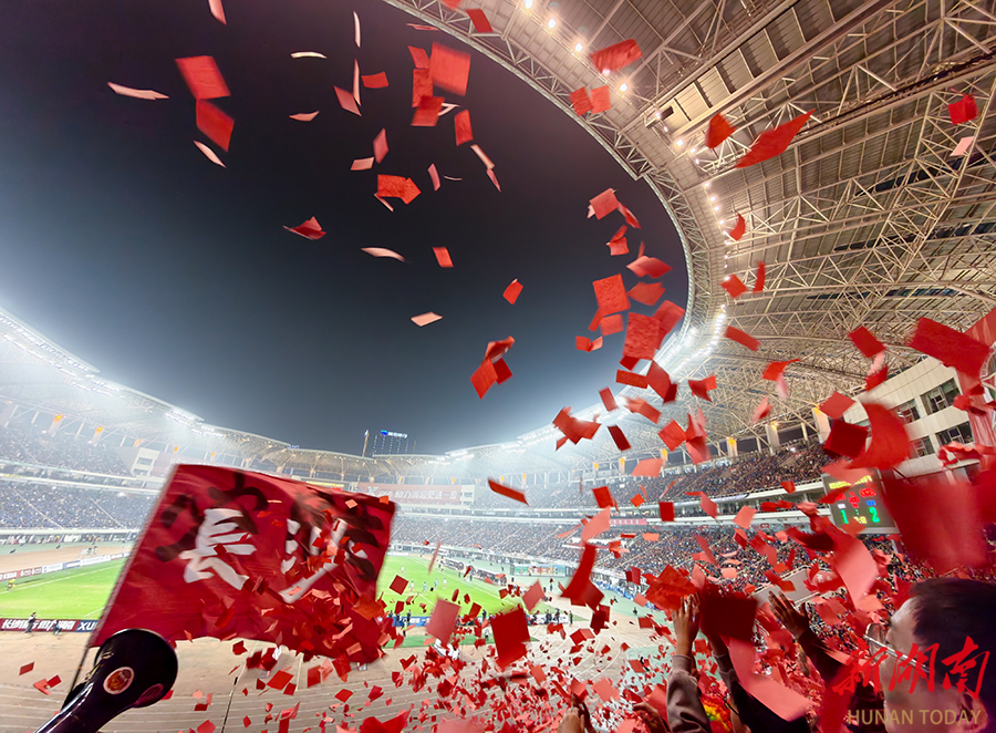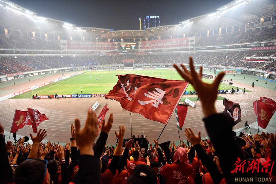 12月20日晚,长沙贺龙体育场,长沙队球迷在加油呐喊。当天,湘超联赛半决赛开赛,“实力之王”长沙队(红)主场迎战“流量之王”永州队,比赛2:2进入点球大战。最终,永州队客场9:8战胜长沙队。 湖南日报全媒体记者 郭立亮 摄
