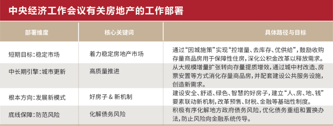 中央经济工作会议将“着力稳定房地产市场”置于“坚持守牢底线,积极稳妥化解重点领域风险”框架之下,表明“稳定市场”必须与“化解风险”同步推进,政策措施相互支撑。会议提出“收购存量商品房用作保障性住房”,一方面能直接帮助房企快速回笼资金,缓解流动性压力,另一方面又增加了保障性住房供应,实现了“去库存”与“保民生”的双赢。“白名单”制度则是另一项协同工具。银行对符合条件的项目实施融资支持,既是通过“保交房”稳定购房者信心,释放合理住房需求,也是通过维持项目正常运转来避免房企风险的进一步恶化,起到了稳定市场与化解风险的双重目标。